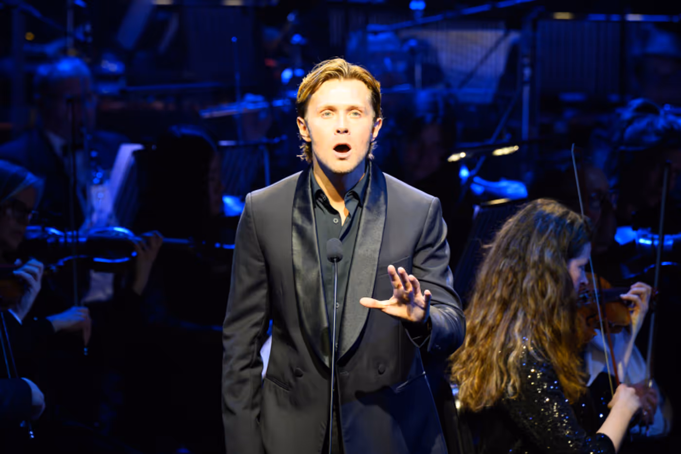 The show was kept simple in terms of staging with the 30 strong orchestra dominating most of the stage but it goes to show that not all one night concerts need to be ‘semi-staged’ as letting the orchestra and the singers simply deliver the music worked perfectly for this concert. Equally when one night concerts can be plagued with technical difficulties this was far from the case, the lighting design by Howard Hudson enhanced the music, giving just enough drama to add some atmosphere but not so much that it was ever distracting. Equally Andrew Johnson the sound engineer achieved the seemingly impossible at these concerts and perfectly balanced the orchestra and the singers throughout the show. There was a glitch with the projected visuals and sound being out of sync however this didn’t distract from the enjoyment of the evening.
