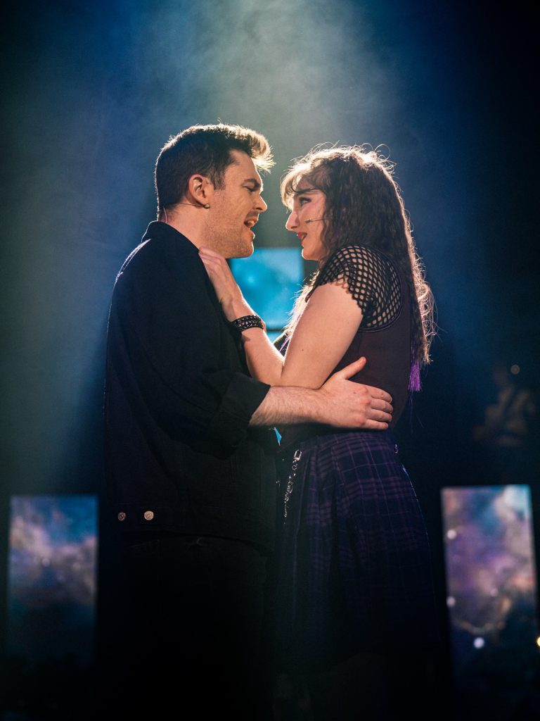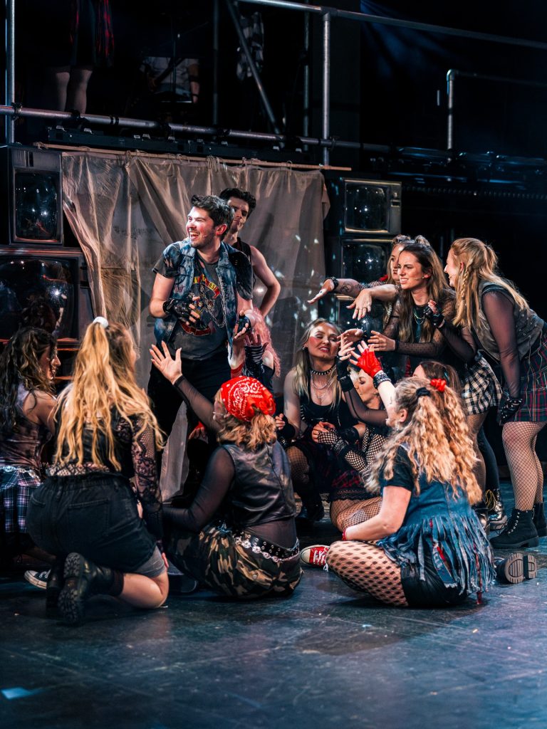One of the stand out things about the show was the technical side of it. Huge video screens flanked either side of the stage as well as columns across the back of the set and it showed a mixture of cleverly designed graphics in keeping with the show along with some moments that were broadcast live. This fit in brilliantly with the futuristic side of the show and also moments where the band were depicted on screen helped the themes of live music really shine through. The video design by Adrian Jeakins was brilliantly considered and incredibly advanced, especially considering just how long amateur shows have to tech a production in situ. The lighting design by Ben Sassoon was also a huge part of the show and everything from the laser cage to the mood lighting was executed flawlessly. The set design was well balanced between creating a fitting placement for each scene balanced with not taking inordinate lengths of time for set changes. Highlights included the banks of old style TVs in the Heartbreak Hotel through to the simple but effective metal fencing in the wasteland.