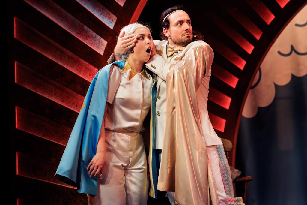 The costumes were simple but clearly defined the roles, while a clever use of the rainbow shaped frame of the stage allowed us to be transported between the human world, a prison below Stonehenge and even the astrological home of Virgo and the others.