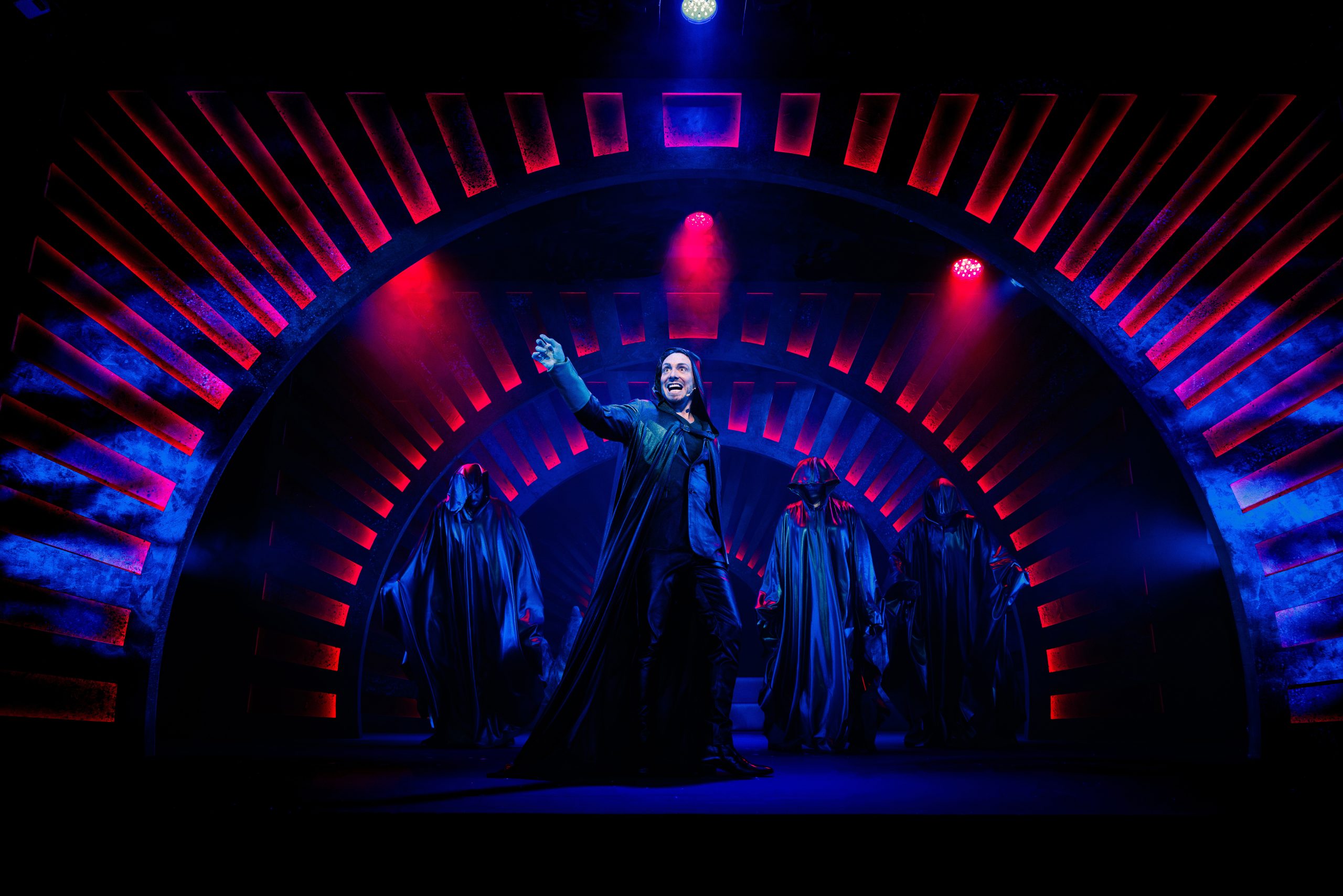The costumes were simple but clearly defined the roles, while a clever use of the rainbow shaped frame of the stage allowed us to be transported between the human world, a prison below Stonehenge and even the astrological home of Virgo and the others.